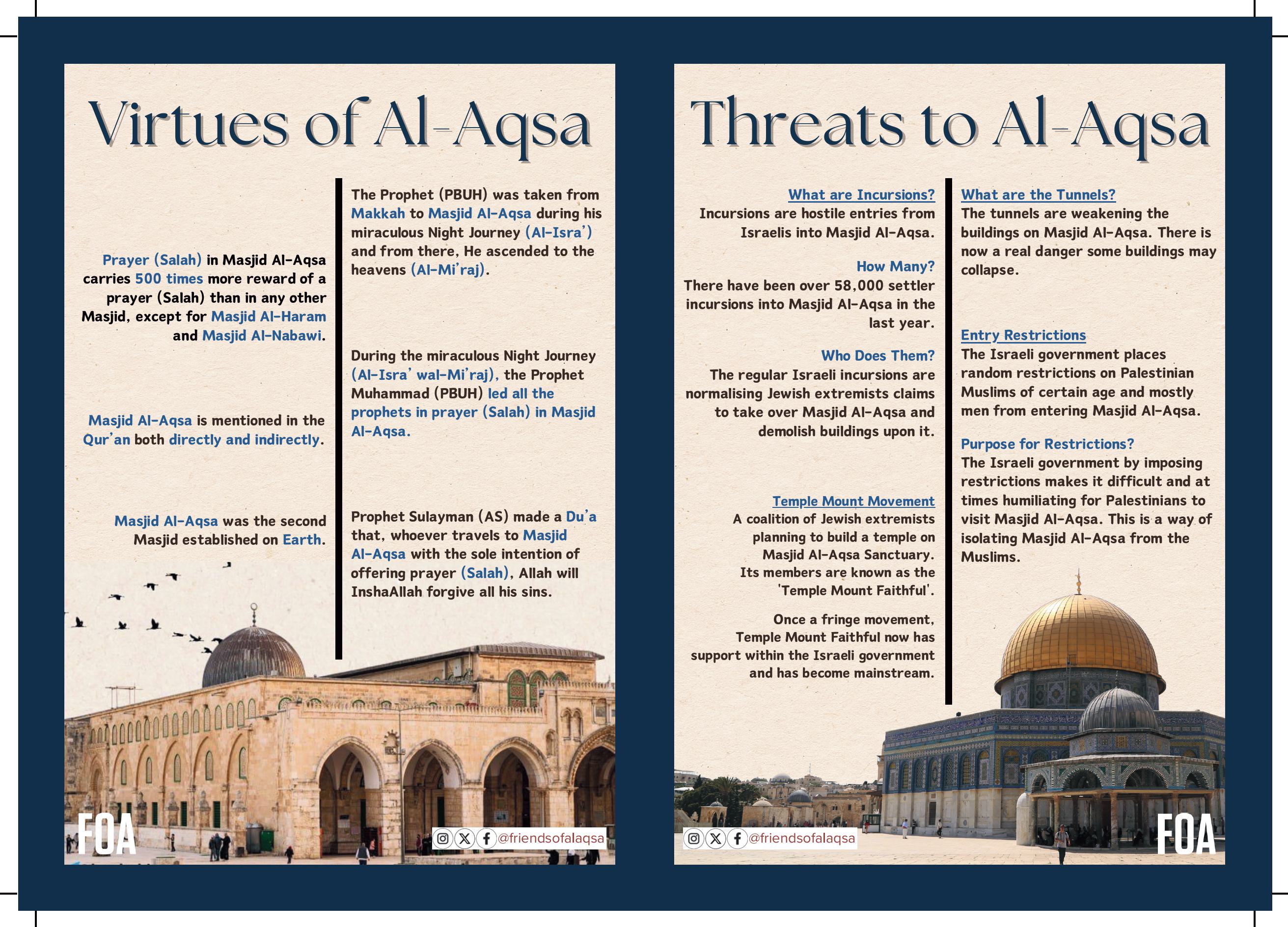 Distribute free Virtues of and Threats to Masjid Al-Aqsa info cards outside your local mosque after Jumuah prayers on Aqsa Week (16th January 2026) to help raise awareness on Masjid Al-Aqsa.