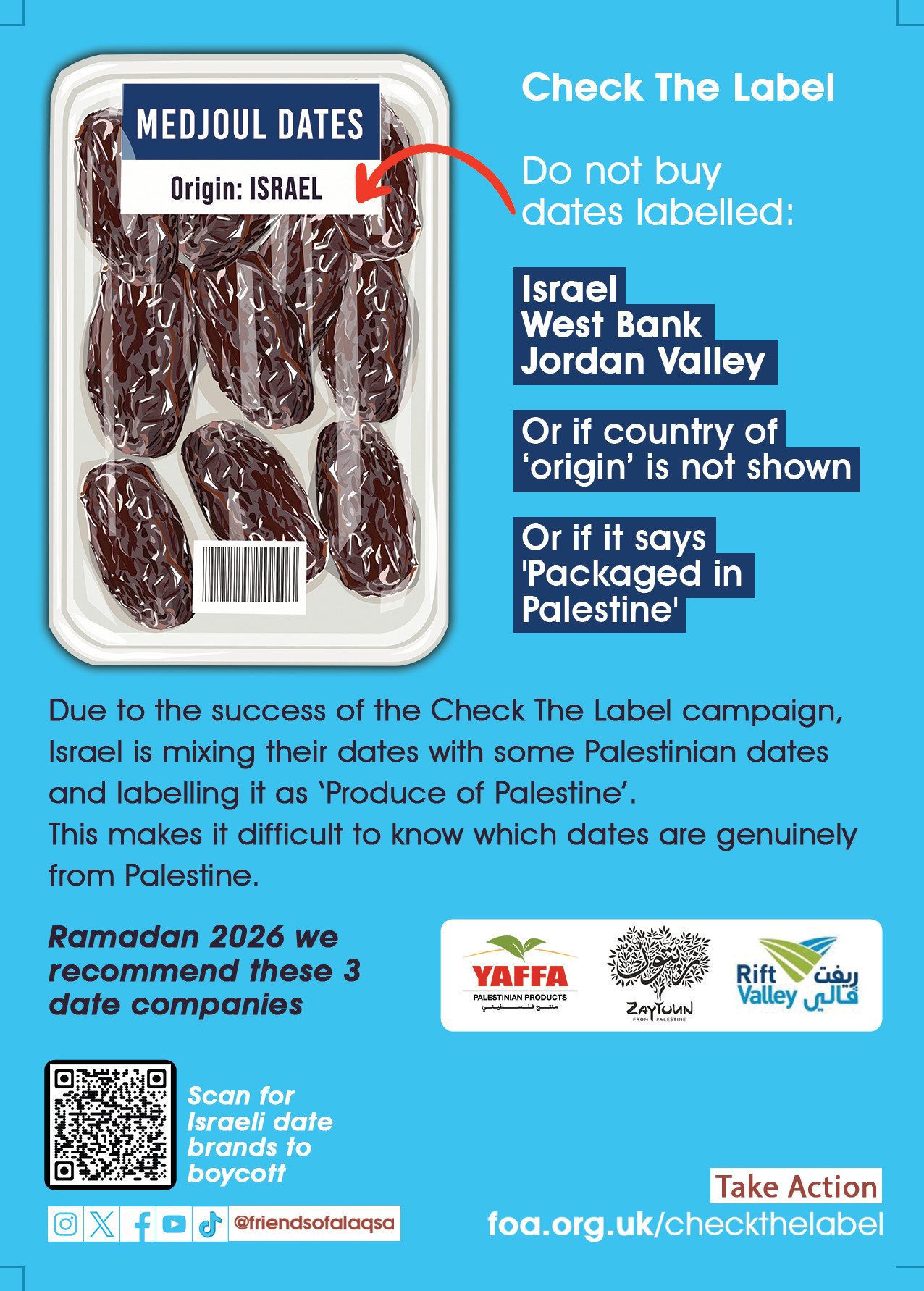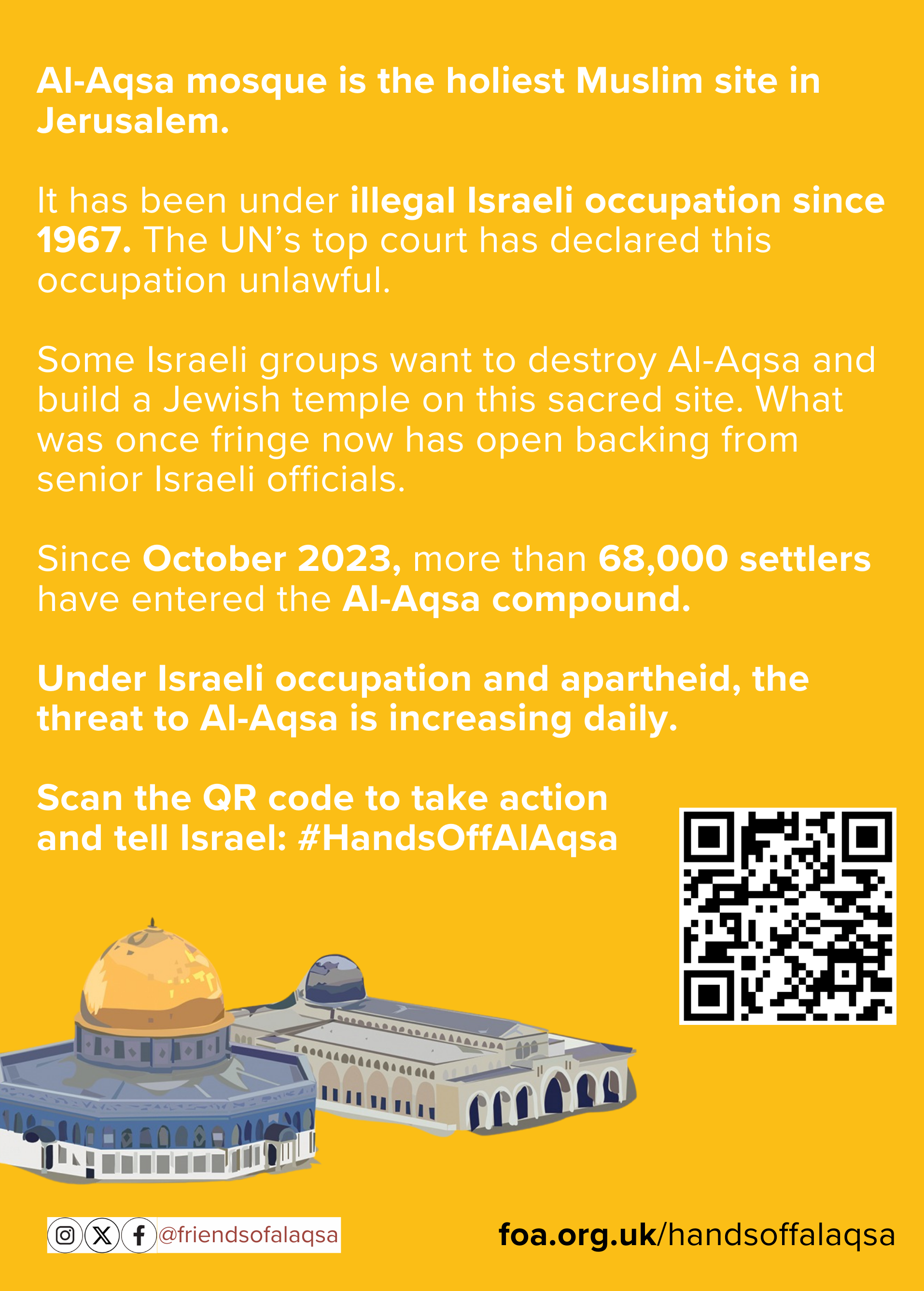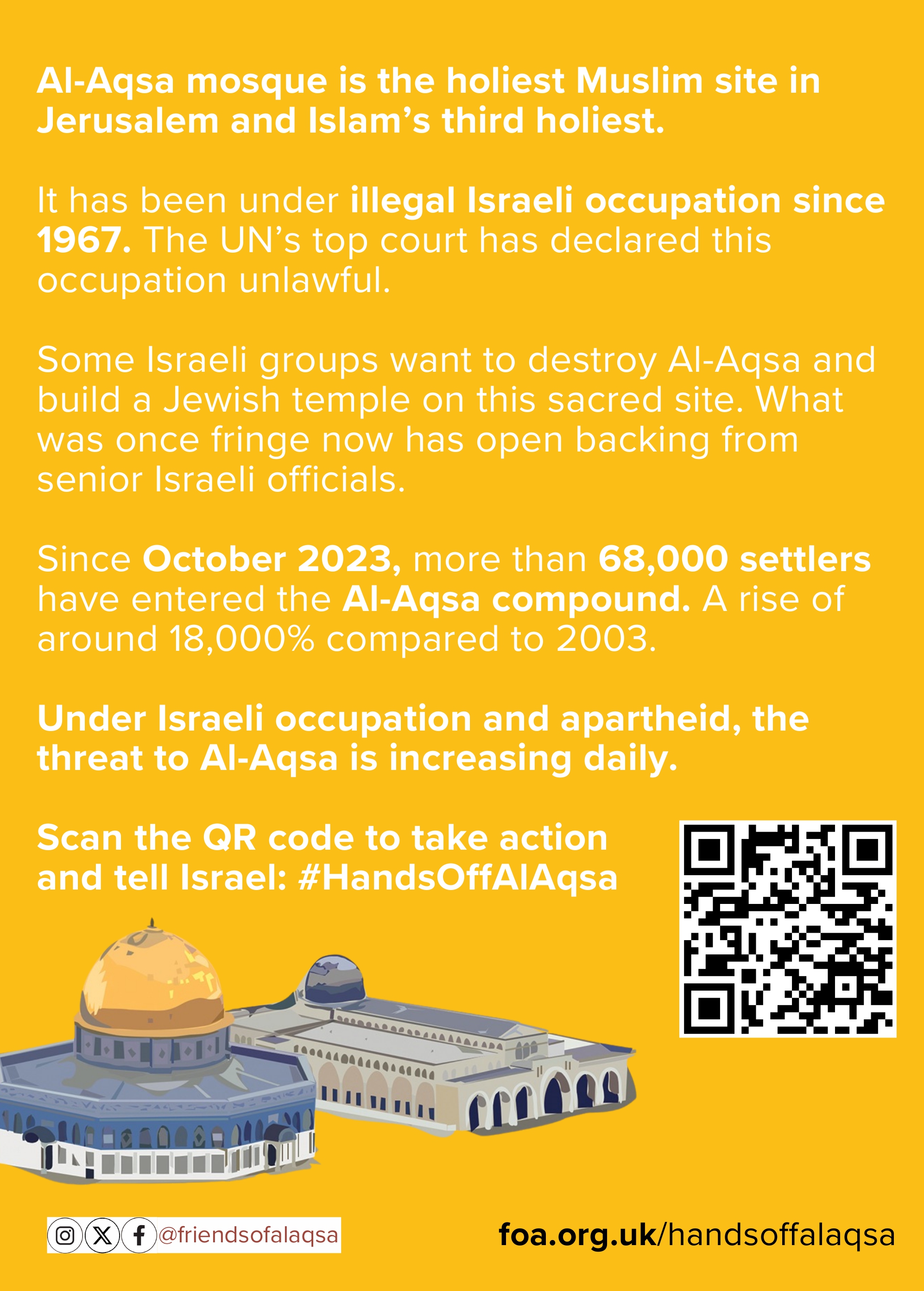 This Ramadan, take action by getting involved in Friends of Al-Aqsa’s campaigns. We are calling on supporters to distribute campaign leaflets after Taraweeh and Jumma (or at a time and place convenient to you). Each week will focus on one of our key campaigns, raising awareness and encouraging meaningful action.