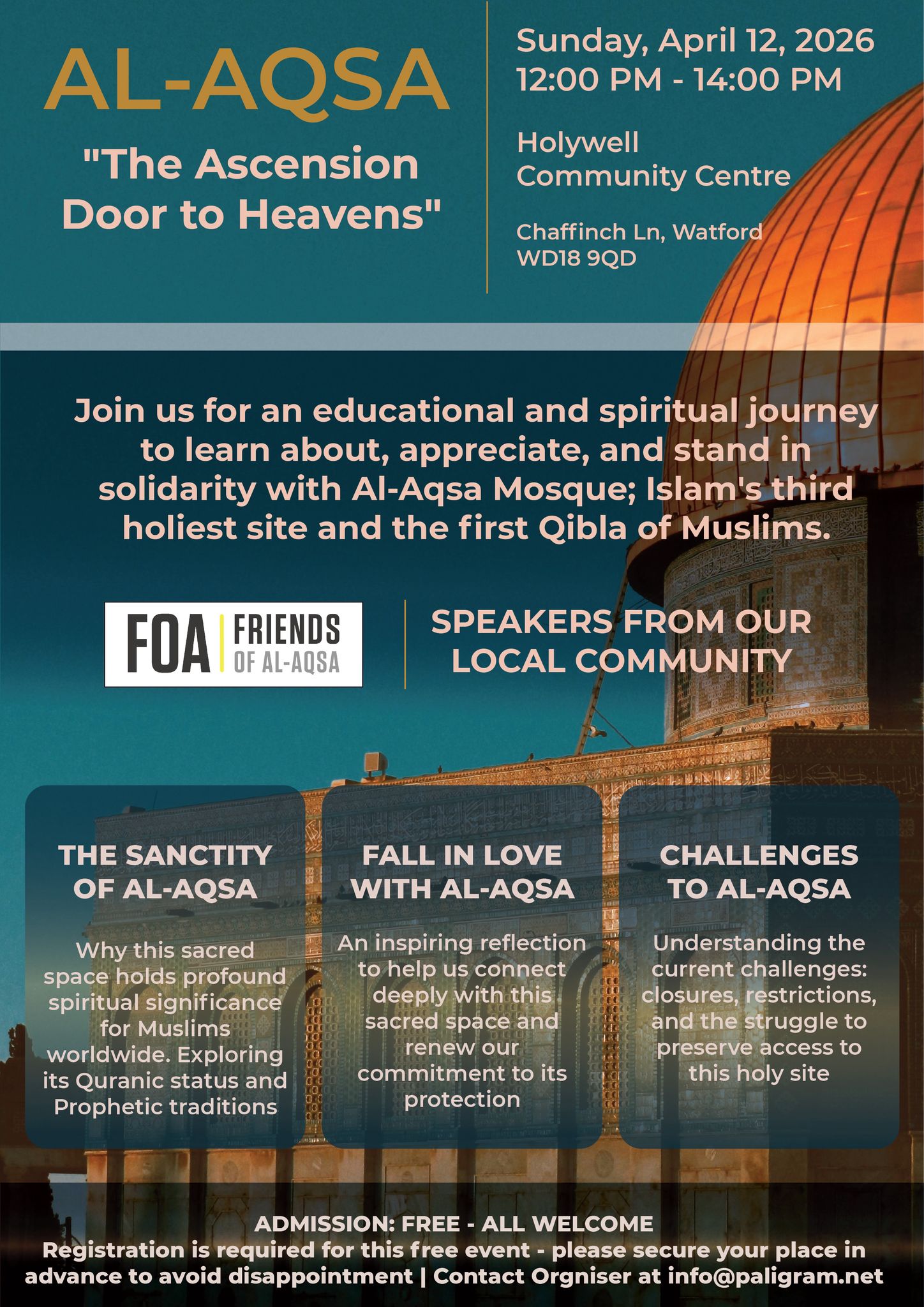 Join us on Sunday, the 12th of April at 12:00 PM for a much needed gathering about Al-Aqsa, which has been forcibly closed in the past month.