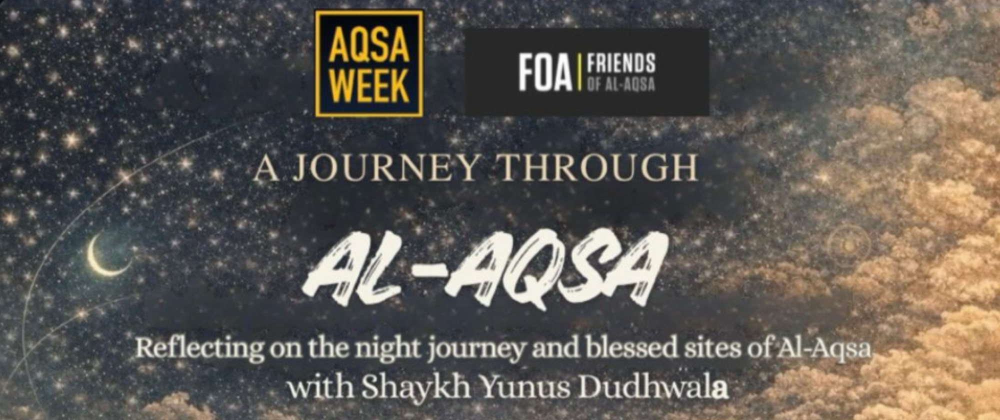 As part of Aqsa Week 2026, join Shaykh Yunus Dudhwala for an inspiring evening exploring the history, significance, and sacred sites of Islam's third holiest site, Masjid Al-Aqsa, in remembrance of Al-Isra’ wal Mi’raj.