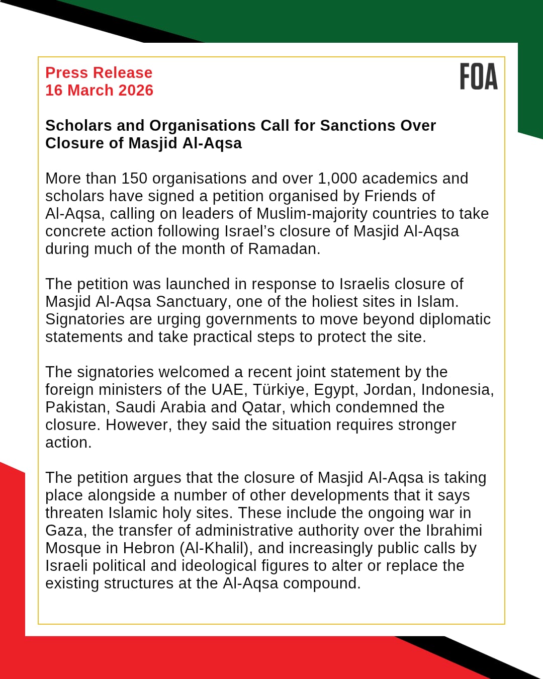 Your generosity allows us to keep campaigning to end Israel’s illegal occupation and apartheid in Palestine. Together we can make a difference. #TeamFOA won’t stop until Palestine is free.